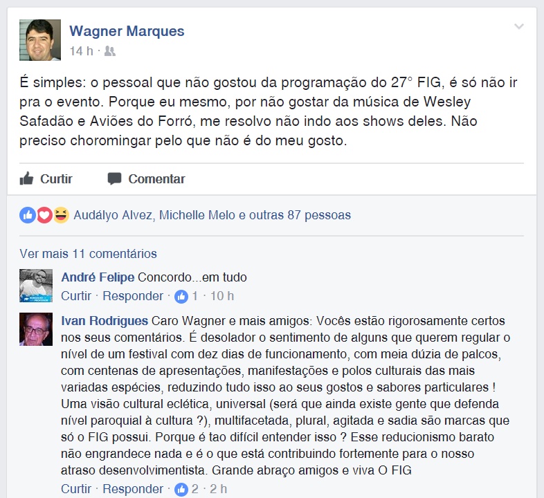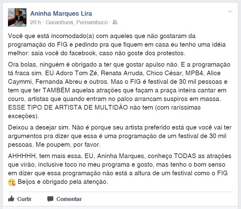 “A voz da ignorância fica julgando mal a programação do FIG pelas atrações que