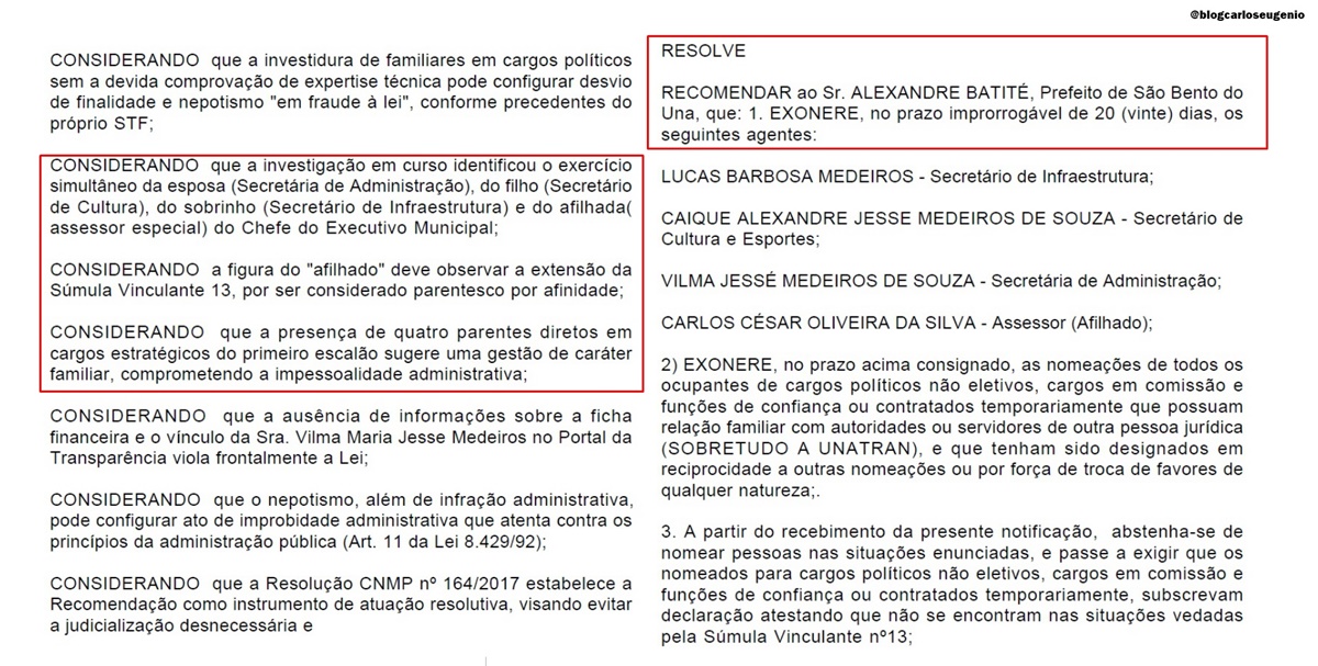 O Promotor Marcio José da Silva Freitas, através da Promotoria de Justiça de São Bento do Una, expediu a Recomendação orientando o Prefeito Alexandre Batité a exonerar, no prazo de até 20 dias, familiares nomeados em cargos estratégicos da Gestão Municipal.