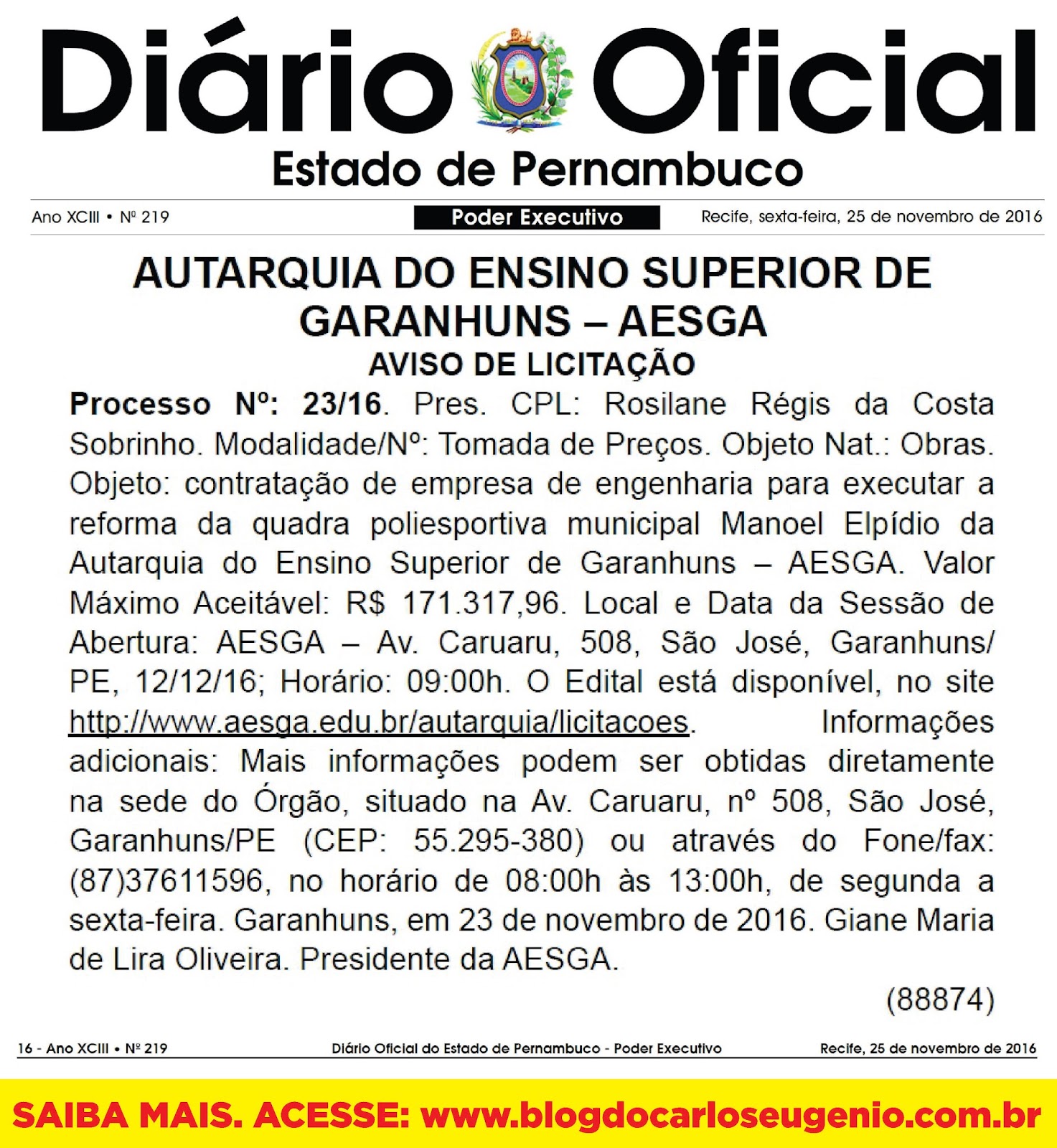 engenharia para executar a reforma, foi publicado no Diário Oficial do Estado