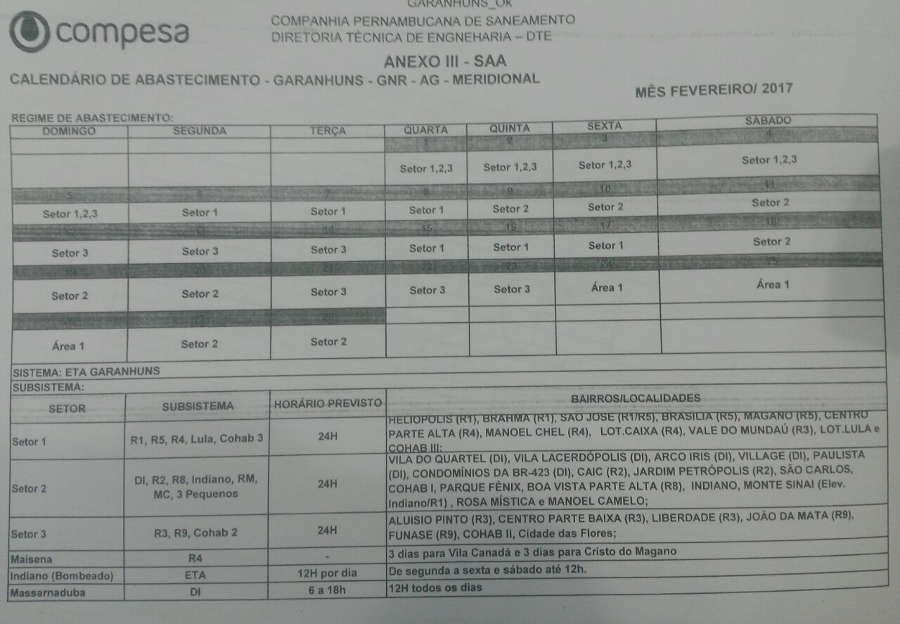 o Calendário de Abastecimento de Garanhuns que deverá ser cumprido pela Compesa: