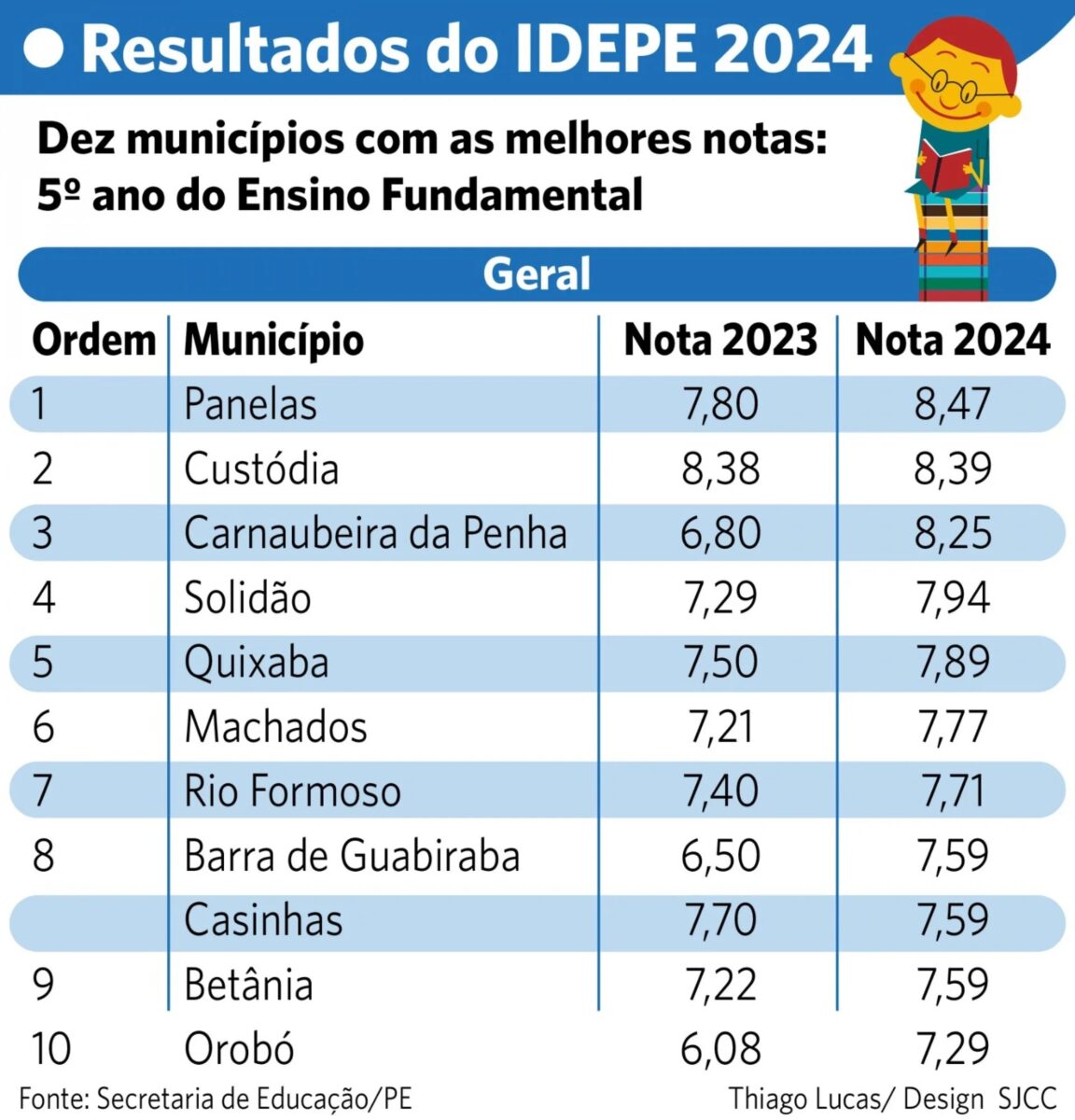 Entre os municípios com melhor desempenho no 5º ano do Ensino Fundamental, Panelas liderou o ranking em 2024, com nota 8,47, seguida por Custódia (8,39) e Carnaubeira da Penha (8,25).