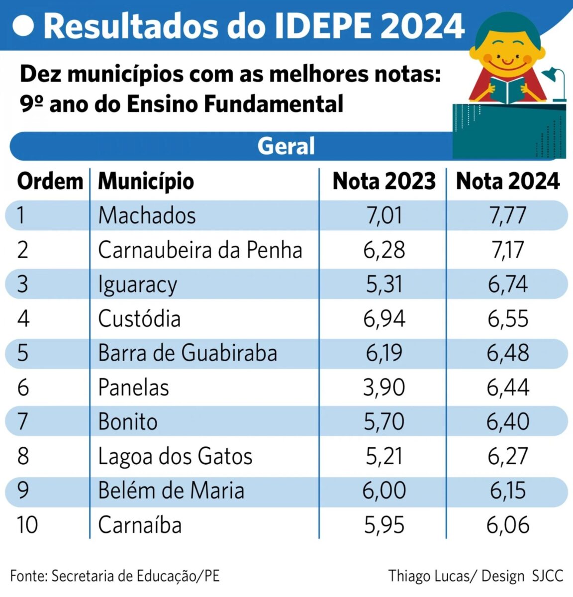 Na avaliação do 9º ano do Ensino Fundamental, Machados ficou em primeiro lugar, com nota 7,77. Em segundo lugar apareceu novamente Carnaubeira da Penha, que avançou 14,17%, passando de 6,28 para 7,17. Em terceiro lugar está Iguaracy, com salto de mais de 26%, de 5,31 para 6,74 entre 2023 e 2024.