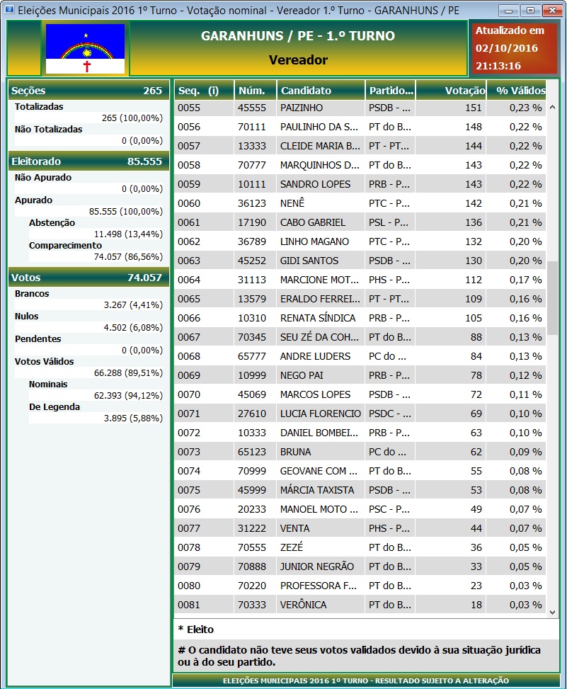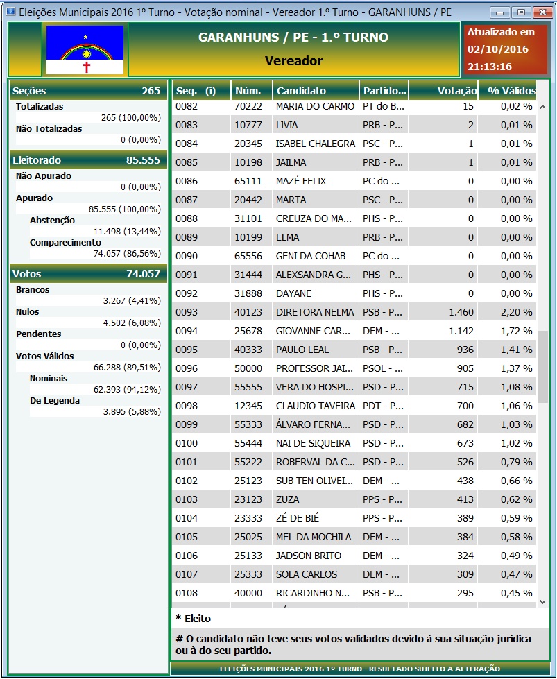 concretizou. Com isso, a lista final dos 13 Vereadores Eleitos em Garanhuns ainda