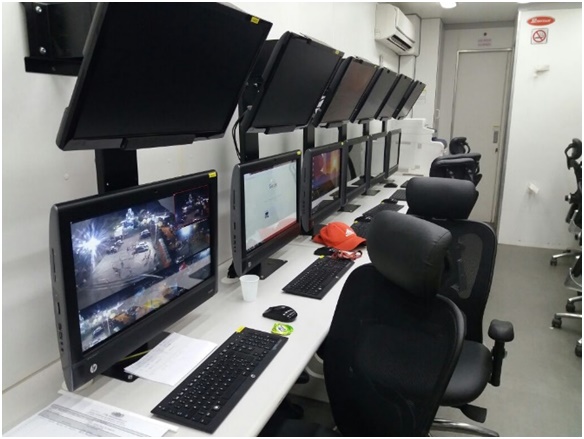 um caminhão baú equipado com vários computadores, climatização e telas de