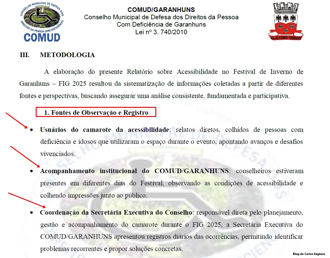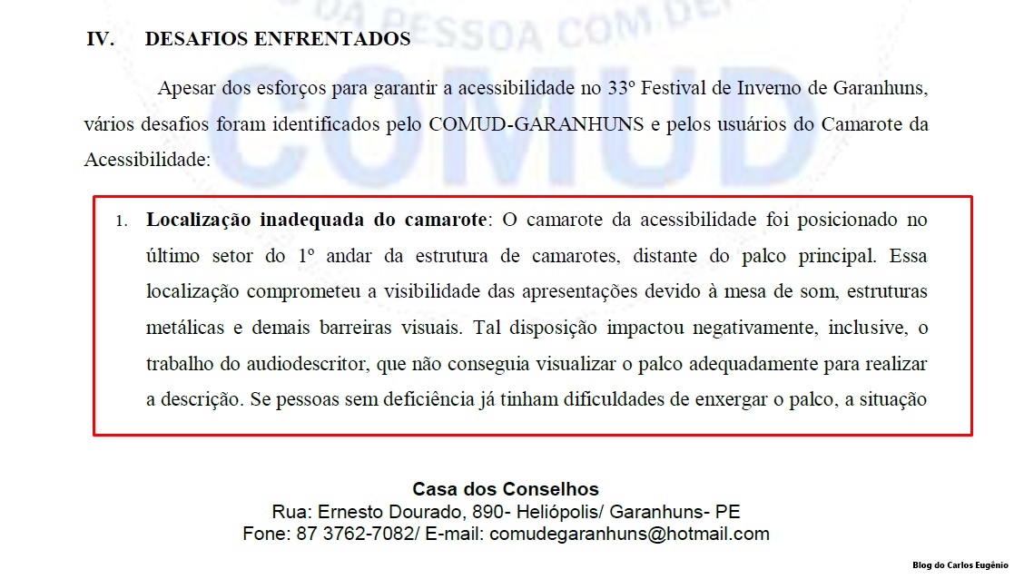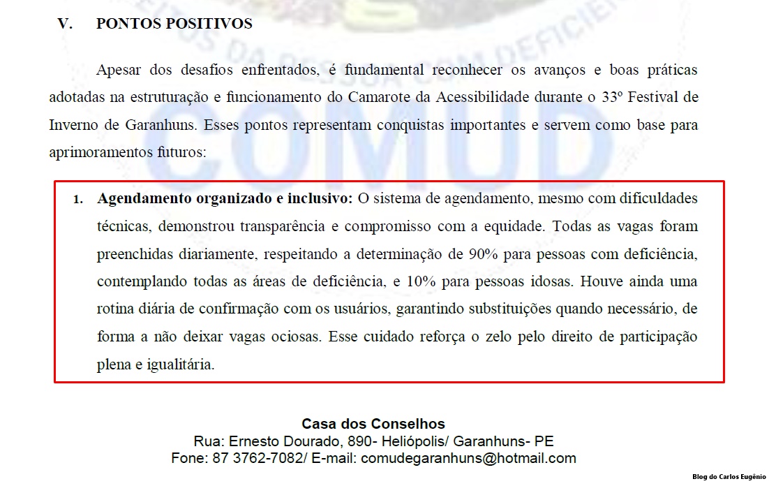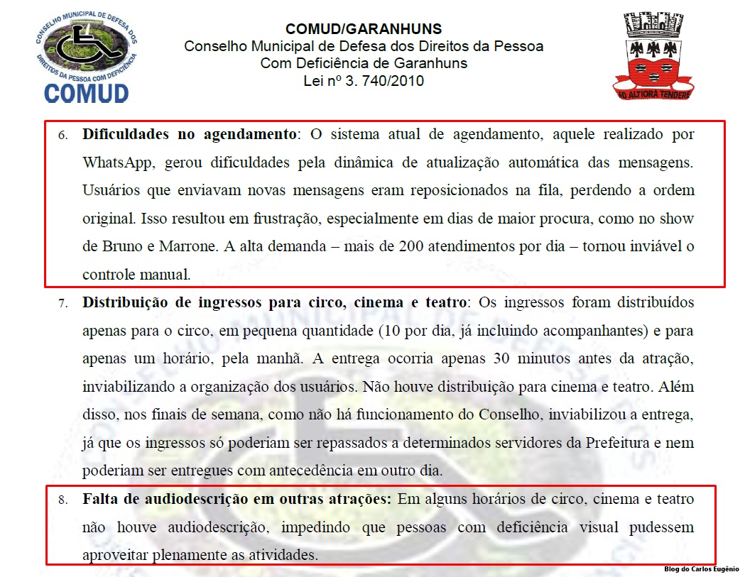 Segundo o Conselho, as informações que constam do Relatório foram coletadas juntos aos usuários do camarote da acessibilidade, do acompanhamento institucional e através da coordenação da Secretária Executiva do COMUD/Garanhuns.