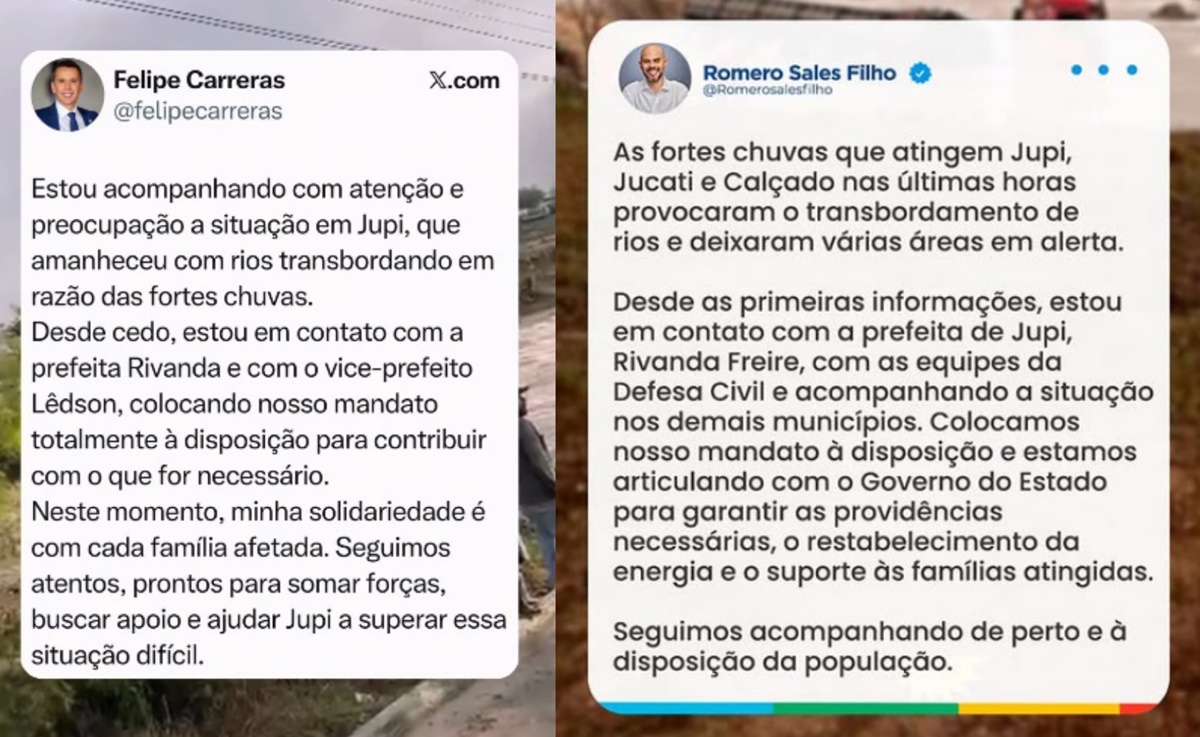 “Recebemos ligações dos deputados Felipe Carreras e Romero Sales e dos senadores Humberto e Fernando Dueire, assim como do amigo Prefeito de Garanhuns, Sivaldo Albino, todos se colocando a disposição para ajudar. Estamos numa força tarefa para auxiliar o povo de Jupi nesse momento tão difícil”, registrou a Prefeita Rivanda Freire.