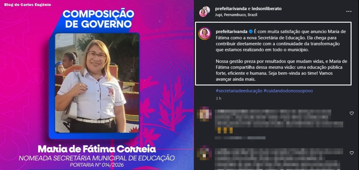 Em publicação nas redes sociais, a Prefeita Rivanda Freire destacou a escolha. “Maria de Fátima chega para contribuir com a continuidade da transformação que estamos realizando. Nossa Gestão preza por uma educação pública forte, eficiente e humana. Vamos avançar ainda mais”, destacou a Prefeita Jupiense. (@blogcarloseugenio)