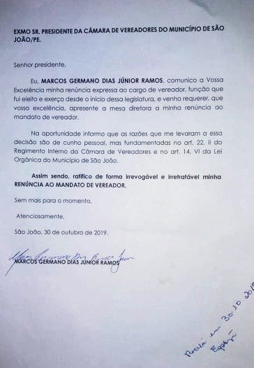 votos nas últimas eleições para Vereador no município de São João, renunciou ao