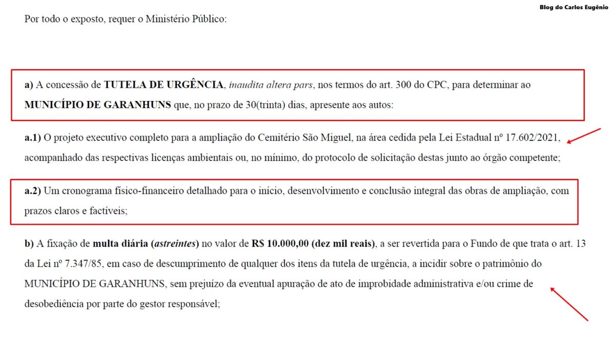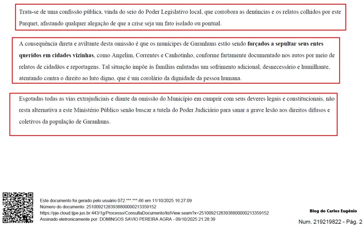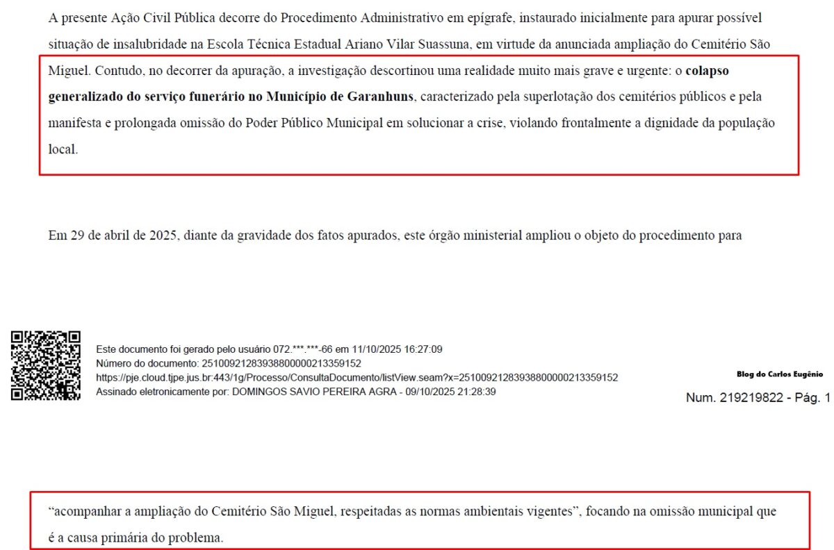 O Ministério Público de Pernambuco (MPPE), por meio do Promotor Domingos Sávio, ingressou com uma Ação Civil Pública (ACP) com pedido de liminar e “Obrigação de Fazer” contra a Prefeitura de Garanhuns, apontando o colapso nos Cemitérios Municipais e omissão da Gestão Municipal em ampliar o Cemitério São Miguel, localizado no bairro Boa Vista.