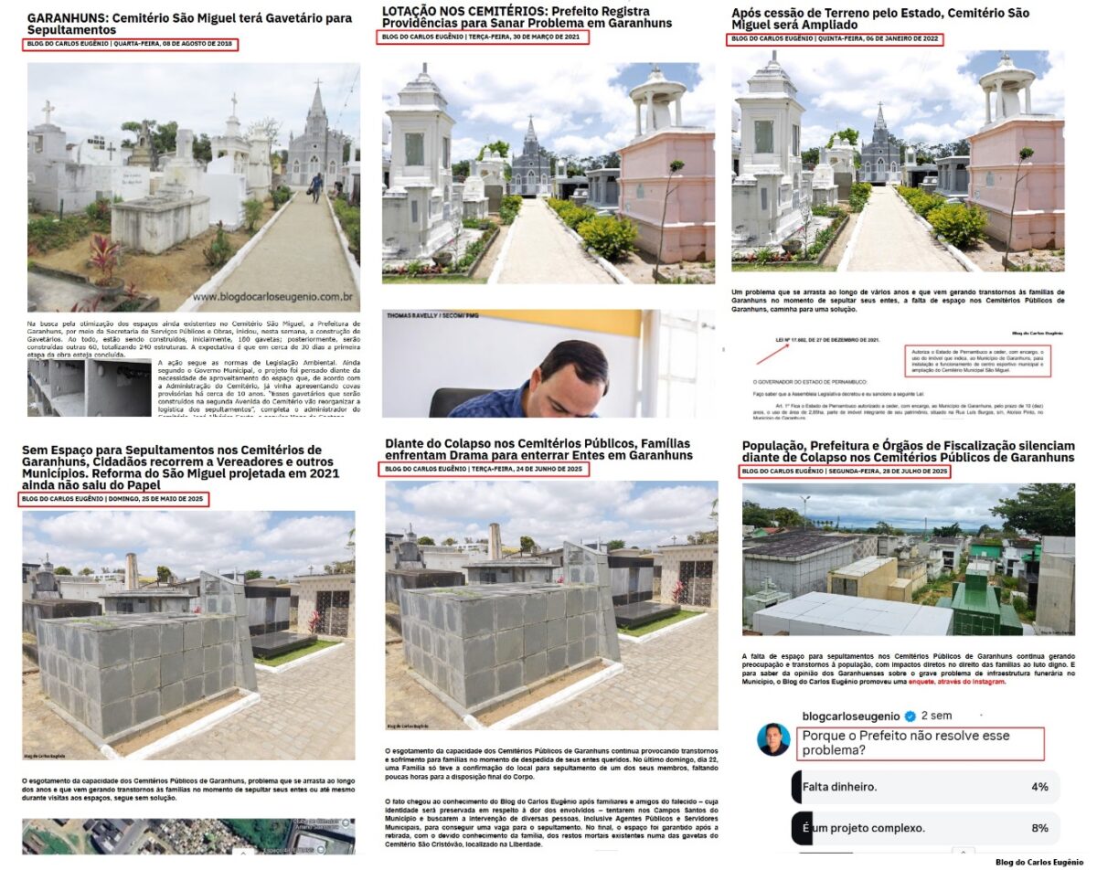 28 de julho de 2025 – POPULAÇÃO, PREFEITURA E ÓRGÃOS DE FISCALIZAÇÃO SILENCIAM DIANTE DE COLAPSO NOS CEMITÉRIOS PÚBLICOS DE GARANHUNShttps://www.blogdocarloseugenio.com.br/populacao-prefeitura-e-orgaos-de-fiscalizacao-silenciam-diante-de-colapso-nos-cemiterios-publicos-de-garanhuns/