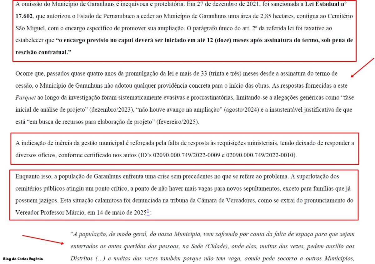 De acordo com a Ação, protocolada no último dia 9, na Vara da Fazenda Pública de Garanhuns, o Município não adotou medidas concretas desde 2021, quando o Estado de Pernambuco cedeu uma área para a ampliação do Cemitério São Miguel, conforme autorizado pela Lei Estadual nº 17.602/2021. O texto da Lei determina que as obras deveriam ser iniciadas em até 12 meses após a assinatura do termo de cessão, prazo que já expirou há quase quatro anos.