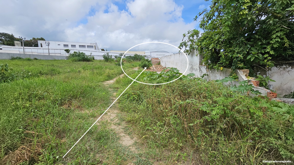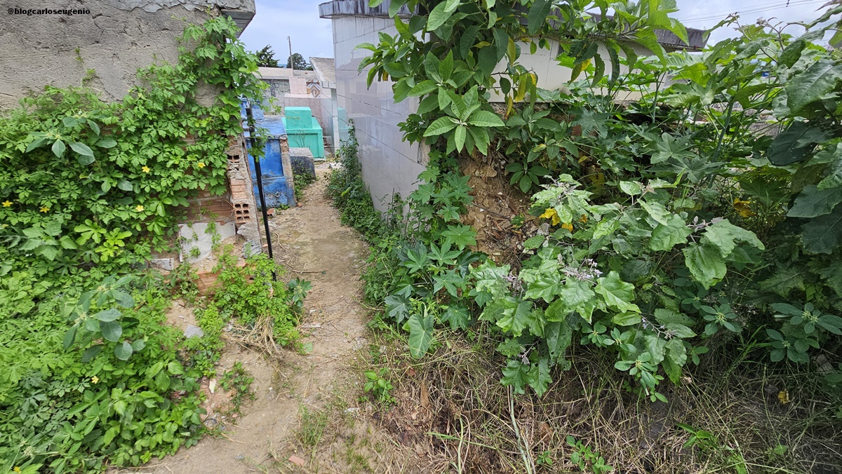 Após passar pelo muro, ainda é preciso percorrer cerca de cem metros em meio tubos de concreto expostos, mato e lixo.