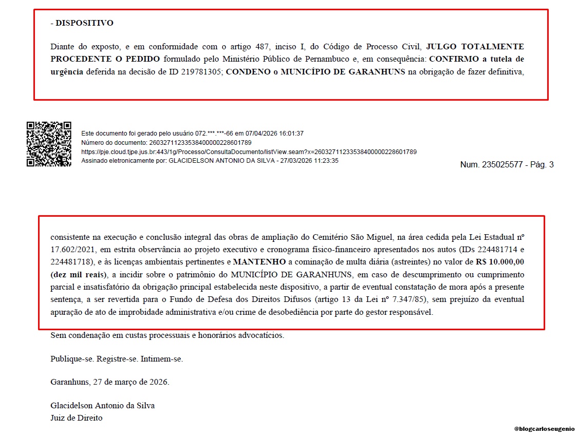 DECISÃO JUDICIAL – A problemática ocorre mesmo após decisão judicial recente. No último dia 27 de março, o Juiz da Vara da Fazenda Pública de Garanhuns confirmou uma liminar do final de 2025 (relembre AQUI) e sentenciou que a Prefeitura conclua integralmente as obras de ampliação do Cemitério São Miguel.