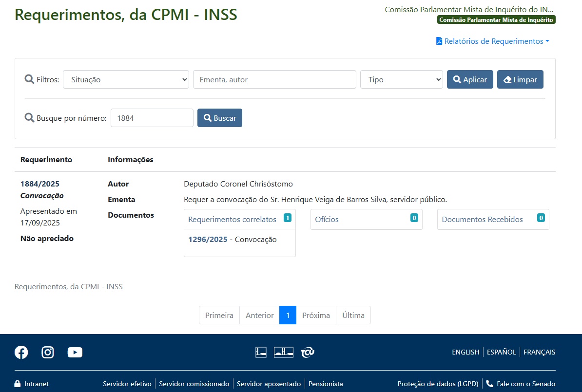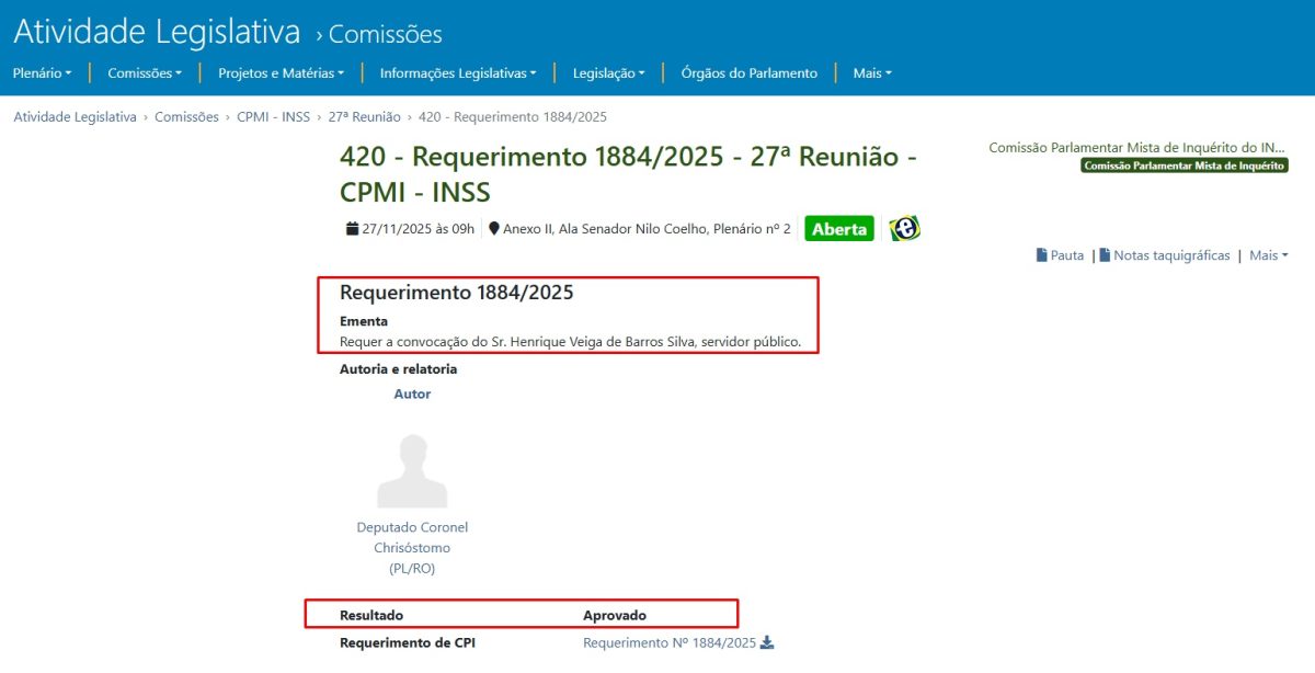 O requerimento de convocação foi apresentado pelo Deputado Coronel Chrisóstomo, do PL, de Roraima. Na justificativa do documento aprovado pela CPMI, que é de consulta pública e pode ser acessado clicando AQUI, o Parlamentar registra que o “servidor público Henrique Veiga de Barros e Silva teria efetivado o desbloqueio de cerca de 70 mil benefícios, distribuídos nas 27 unidades da Federação”.