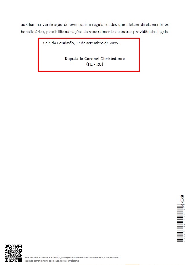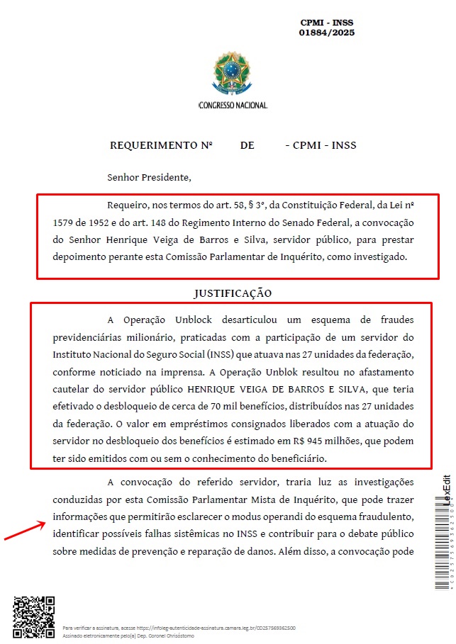 “A convocação do referido Servidor, traria luz as investigações conduzidas por esta Comissão Parlamentar Mista de Inquérito, que pode trazer informações que permitirão esclarecer o modus operandi do esquema fraudulento, identificar possíveis falhas sistêmicas no INSS e contribuir para o debate público sobre medidas de prevenção e reparação de danos”, registra a justificativa do deputado Coronel Chrisóstomo.
