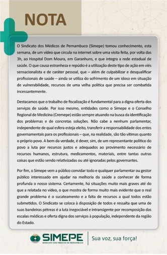 Médicos de Pernambuco (SIMEPE) não foi de aprovação a atitude do Deputado, pelo