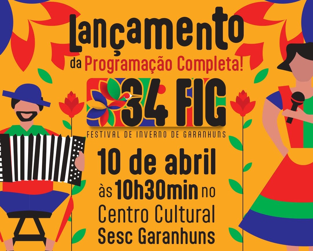 A Prefeitura de Garanhuns, por meio da Secretaria de Cultura, realiza na próxima sexta-feira, dia 10, o lançamento oficial da programação da 34ª edição do Festival de Inverno de Garanhuns (FIG). O evento acontecerá de 9 a 26 de julho. A apresentação da grade acontecerá no Teatro Reinaldo de Oliveira, no Sesc, a partir das 10h30min.