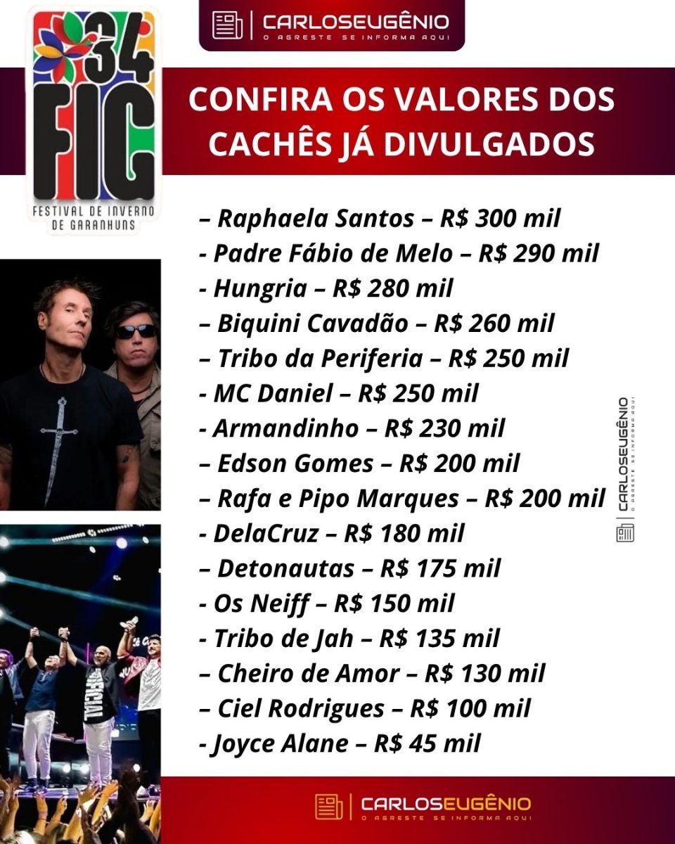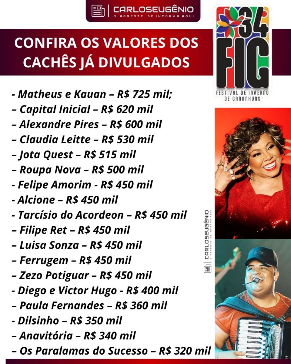 Ainda há cachês que não foram divulgados oficialmente, como os de Belo, Aduílio Mendes e da dupla Felipe e Rodrigo. A expectativa é de que, com a consolidação de todos os contratos, o investimento apenas no Palco Mestre Dominguinhos se aproxime dos R$ 15 milhões de reais.