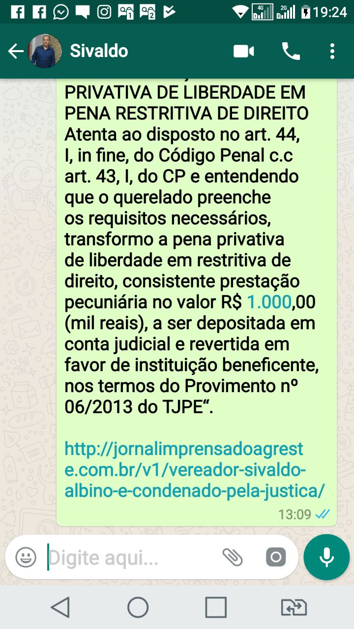 Sivaldo Albino (PPS), via WhatsApp (imagem ao lado), para que pudesse se posicionar a