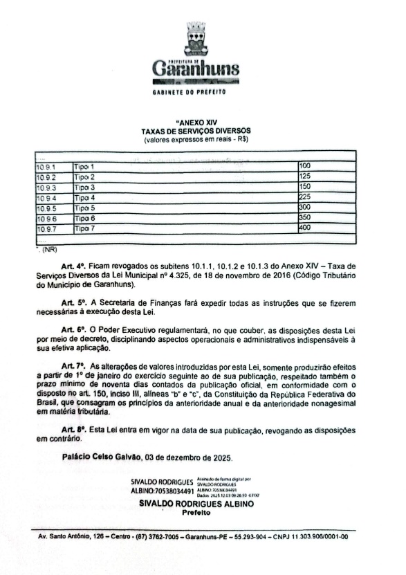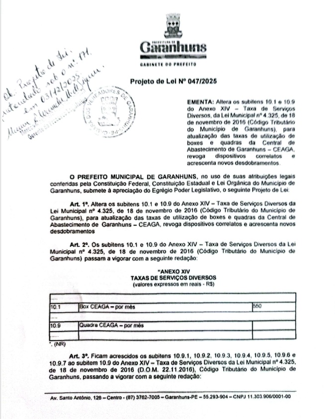 O Prefeito Sivaldo Albino (PSB) encaminhou à Câmara de Garanhuns, em regime de urgência urgentíssima, o Projeto de Lei nº 047/2025, que propõe a atualização das Taxas cobradas pela utilização de boxes e quadras da Central de Abastecimento de Garanhuns (CEAGA).