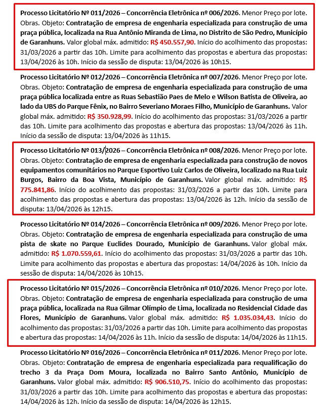 A Prefeitura de Garanhuns publicou, no Diário Oficial desta segunda-feira, dia 30, uma série de avisos de licitação que totalizam investimentos de aproximadamente R$ 4,5 milhões em obras de infraestrutura urbana e equipamentos públicos.