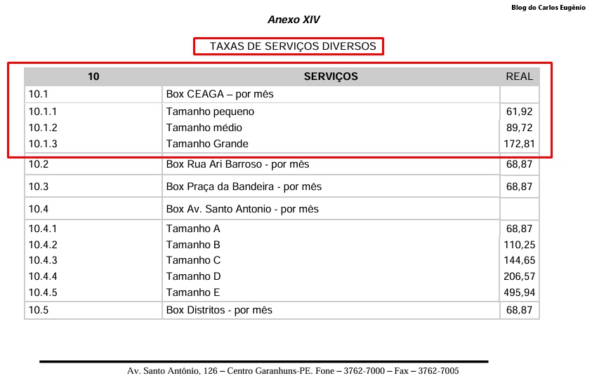 O texto também disciplina o número e o tamanho das unidades disponíveis, com 37 boxes e diversas quadras de diferentes metragens. Entre as obrigações dos permissionários estão o pagamento mensal de uma taxa de ocupação, que segundo o Código Tributário Municipal (Lei 4.325/2016), varia de R$ 61,92 a R$ 172,81, a depender do tamanho do imóvel.