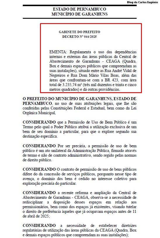 As novas regras também determinam que todas as benfeitorias realizadas nas áreas públicas passam a integrar o patrimônio do Município. Para saber mais, baixe AQUI o Decreto nº 044/2025. (@blogcarloseugenio)