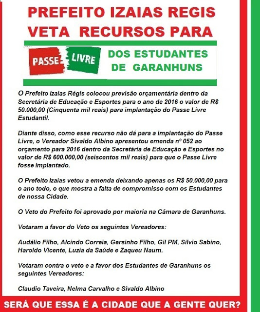 de 2013, Ele solicitou através de requerimento a implantação do Passe Livre,