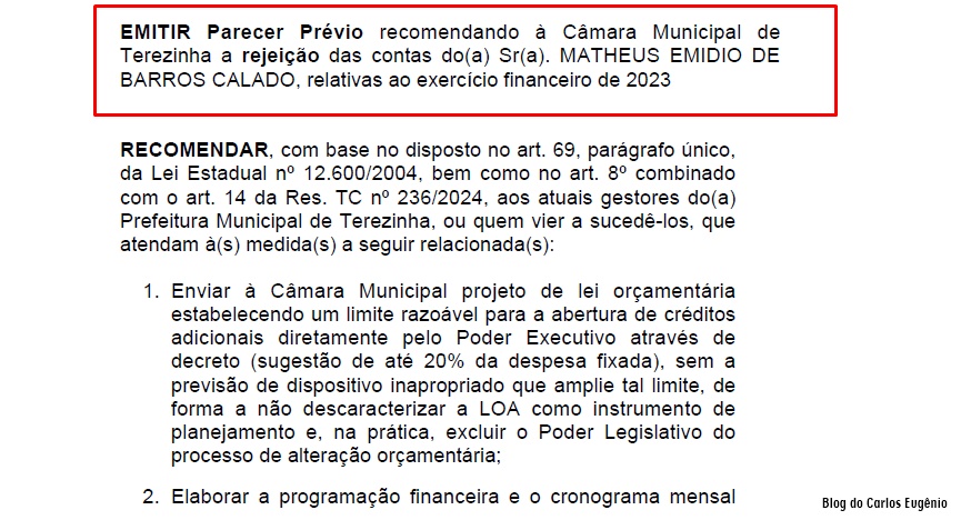 Além da rejeição das contas, o Tribunal fez recomendações à atual Gestão, como o recolhimento integral e tempestivo das contribuições, a adoção de plano de amortização do déficit atuarial e o reforço na transparência pública. O Parecer será encaminhado à Câmara Municipal de Terezinha, órgão responsável pelo julgamento político das contas. Para saber mais clique AQUI e acesse entre as Páginas 60 e 64. (@blogcarloseugenio)