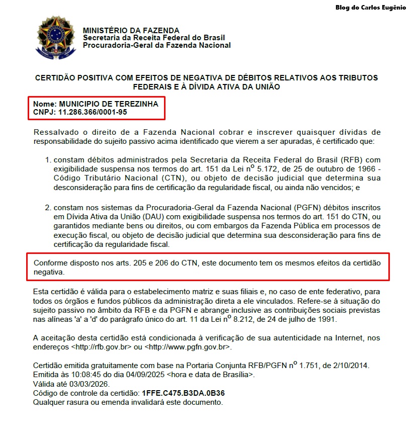 O município de Terezinha regularização a situação fiscal junto à União, emitindo a Certidão Negativa de Débitos Federal (CND) pela primeira vez desde 2005. O documento, fornecido pela Receita Federal e pela Procuradoria-Geral da Fazenda Nacional, comprova que o Município não possui pendências financeiras com o Governo Federal.