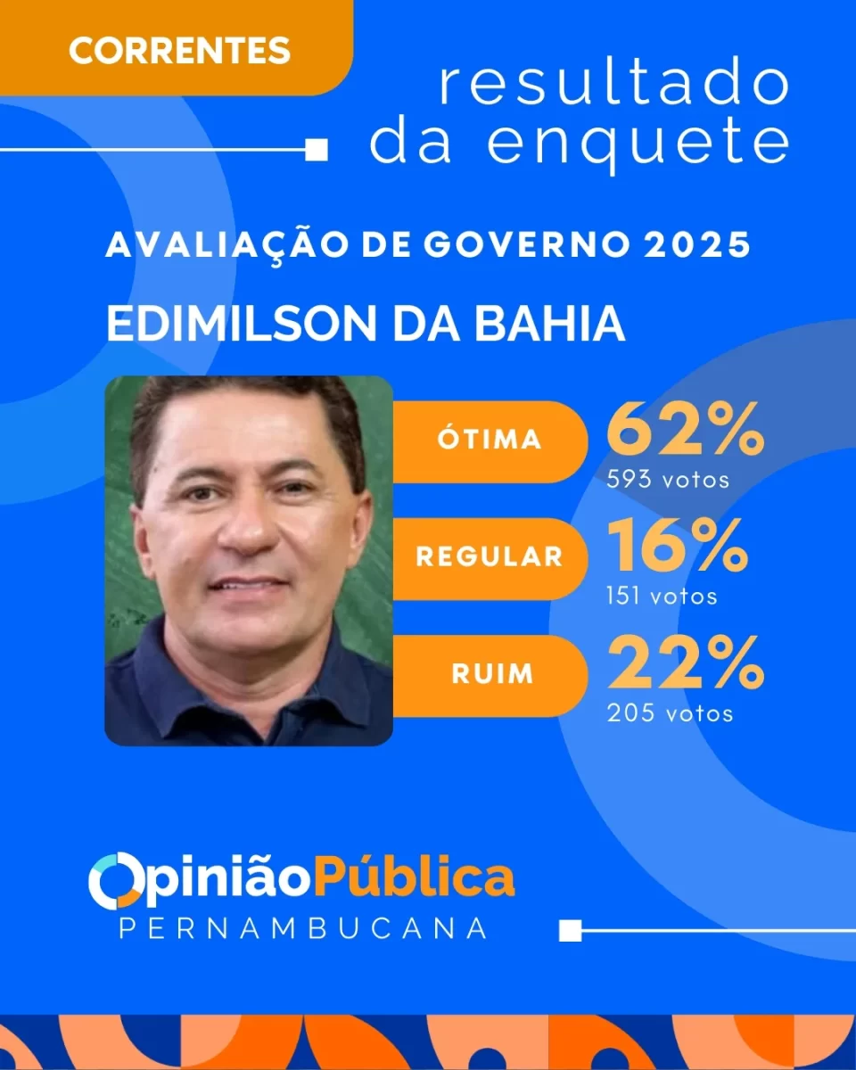 O perfil Opinião Pública Pernambucana segue realizando enquetes no Instagram para medir a percepção dos internautas sobre o desempenho administrativo de Gestores Municipais em Pernambuco. Recentemente, o levantamento informal avaliou a gestão do Prefeito de Correntes, Edimilson da Bahia (PT).