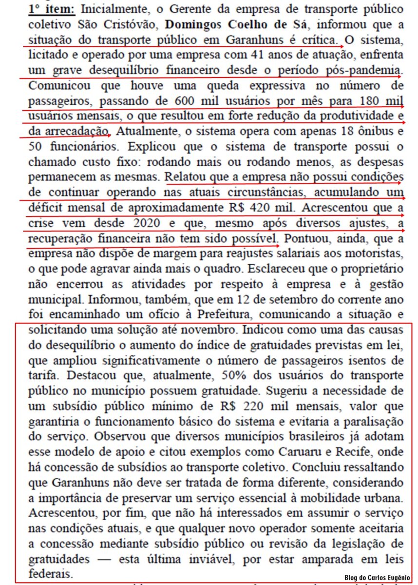 Domingos Sá defendeu a implantação de um subsídio público mensal de R$ 220 mil, valor que, segundo ele, garantiria o funcionamento básico do sistema e evitaria a interrupção total do serviço. “Diversos municípios brasileiros, como Caruaru e Recife, já adotaram esse modelo de apoio. Garanhuns não pode ser tratada de forma diferente”, enfatizou.