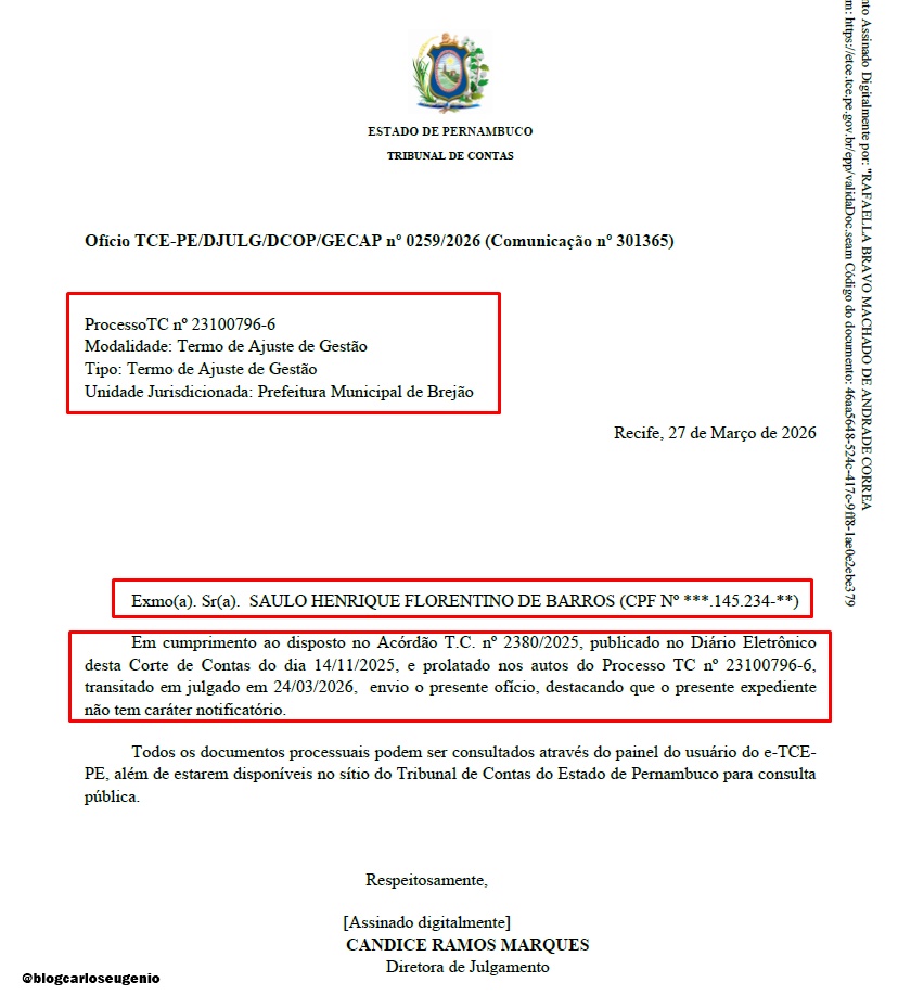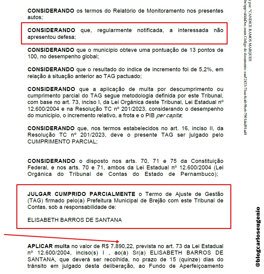 O Tribunal de Contas de Pernambuco (TCE-PE) julgou, no último dia 10 de novembro, como parcialmente cumprido o Termo de Ajuste de Gestão (TAG) firmado com a Prefeitura de Brejão e aplicou multa de R$ 7.890,22 à então Prefeita Beta Cadengue.