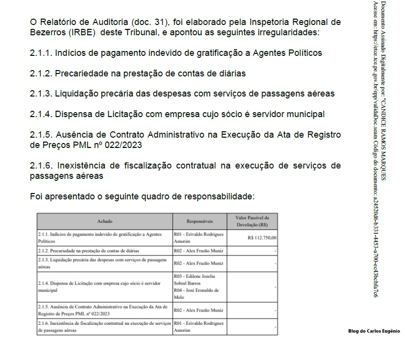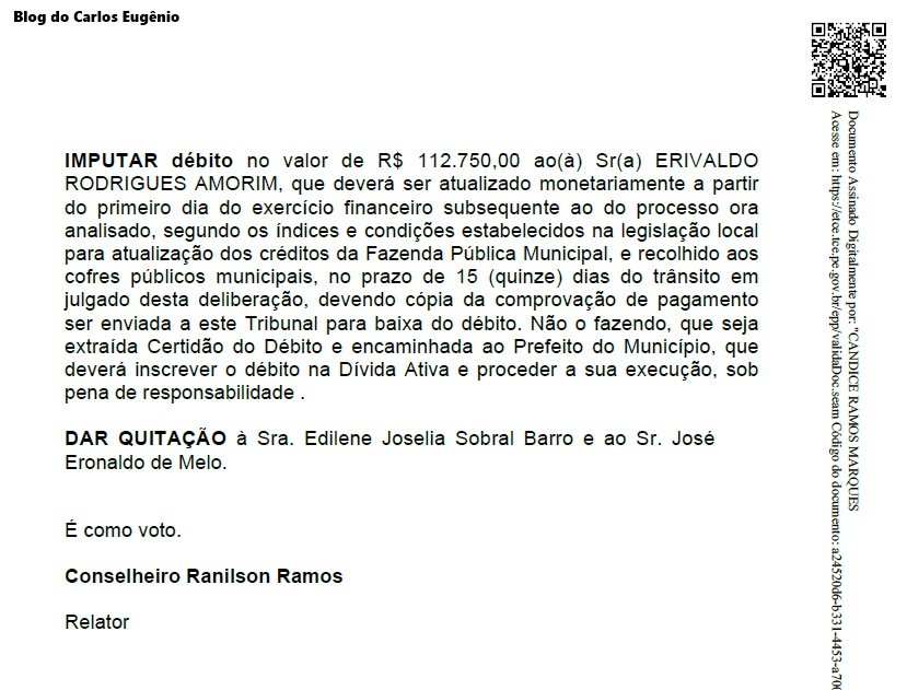 Segundo o relatório, o Prefeito Erivaldo Chagas, reeleito em 2024, autorizou o pagamento de 13º salário aos Secretários Municipais sem previsão em Lei específica, o que contraria a Constituição e a jurisprudência do próprio TCE. O Órgão imputou ao Prefeito a devolução de R$ 112.750,00 aos cofres públicos municipais, valor atualizado e a ser pago em até 15 dias após o trânsito em julgado da decisão.