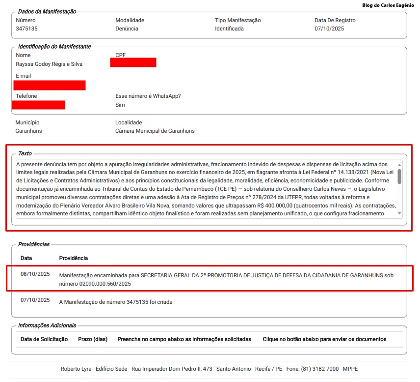 A denúncia de Rayssa Régis também foi direcionada ao Ministério Público, que ainda não se posicionou publicamente sobre o assunto.