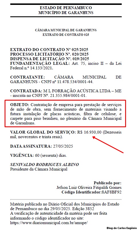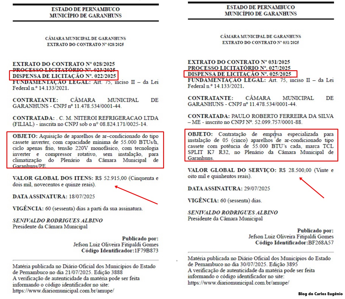As contratações, que somam R$ 407.708,00, foram voltadas a instalação de placas acústicas, compra de materiais de manutenção, serviços elétricos, compra e instalação de ar-condicionado, mobiliário, painel de LED e caixas de som, todos voltados ao mesmo espaço físico e tinham como objetivo a requalificação do plenário daquela Casa Legislativa.