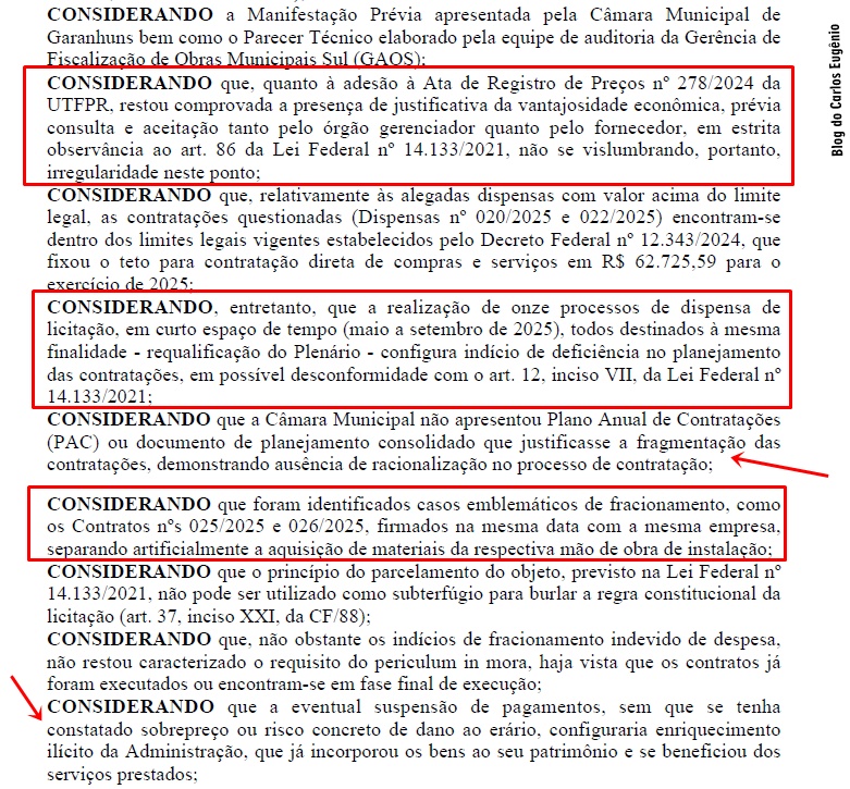 Diante dos documentos de defesa apresentados pela Câmara, através do presidente, o vereador Johny Albino (PSB), o TCE considerou que, embora a adesão à ata da UTFPR estivesse devidamente justificada e dentro dos parâmetros legais, foram identificados indícios de fracionamento indevido de despesas. Segundo o Relator, a realização de 11 dispensas em curto intervalo de tempo, todas com a mesma finalidade, evidencia falta de planejamento nas contratações.