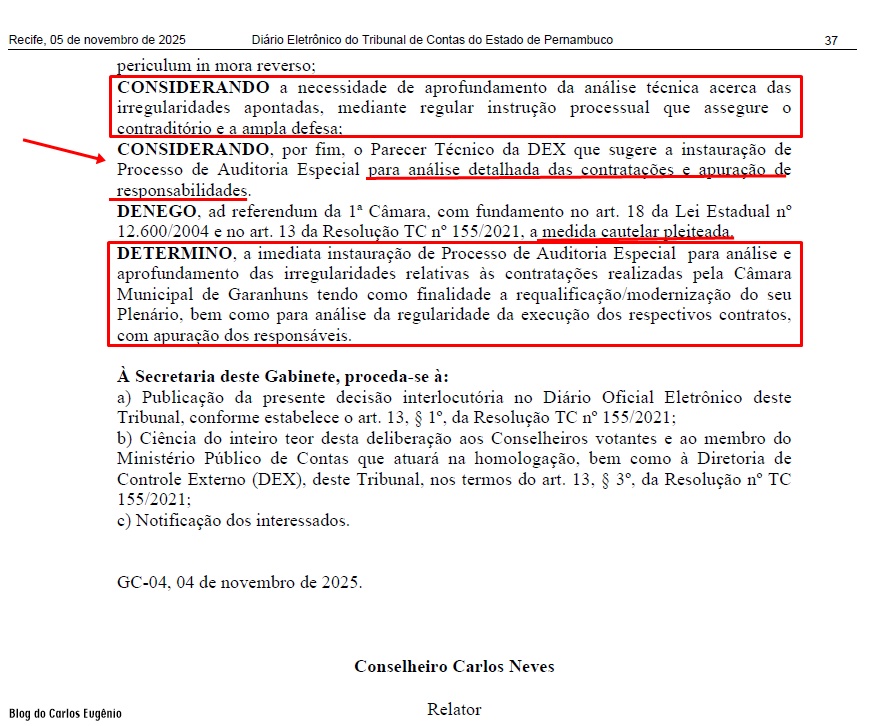 O Tribunal de Contas de Pernambuco (TCE-PE) decidiu, nesta terça-feira, dia 4, negar pedido de medida cautelar formulado em representação apresentada contra a Câmara de Vereadores de Garanhuns, mas determinou a abertura de uma Auditoria Especial para apurar possíveis irregularidades nas contratações realizadas para a reforma e modernização do Plenário Vereador Álvaro Brasileiro Vila Nova.
