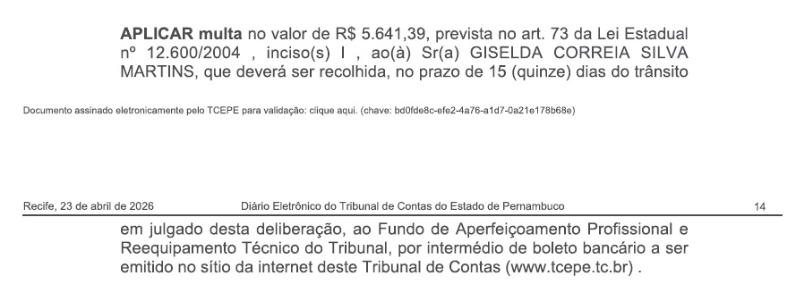 Apesar das irregularidades, o TCE-PE ressaltou que não houve comprovação de dano ao erário nem de enriquecimento ilícito por parte dos Gestores, o que influenciou na dosimetria das penalidades. As falhas foram classificadas, em grande parte, como de natureza formal, relacionadas à organização administrativa. Ainda assim, foram aplicadas multas que variam de R$ 5.641,39 a R$ 7.897,95.