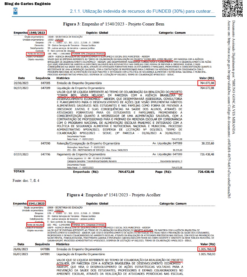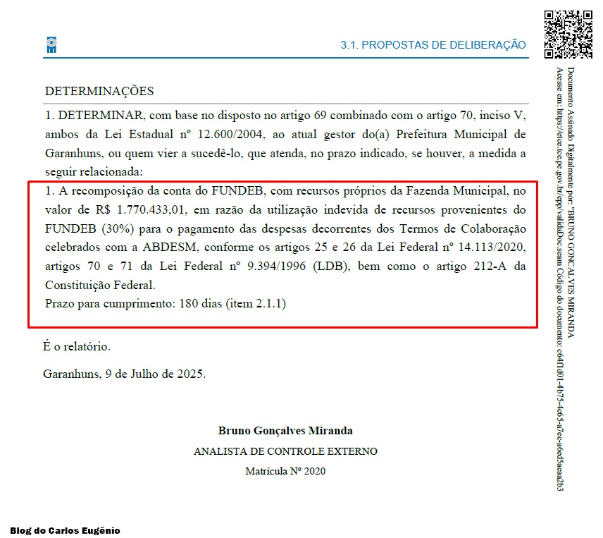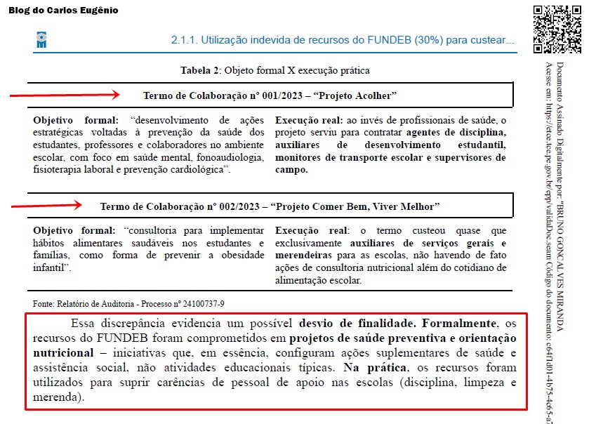 De acordo com o Relatório de Auditoria, a equipe técnica do TCE-PE identificou irregularidades na utilização de recursos do FUNDEB. Em junho de 2023, foram empenhados e pagos R$ 1.770.433,01 com recursos do fundo, sendo R$ 764.672,08 no projeto “Comer Bem” e R$ 1.005.760,93 no projeto “Acolher”.