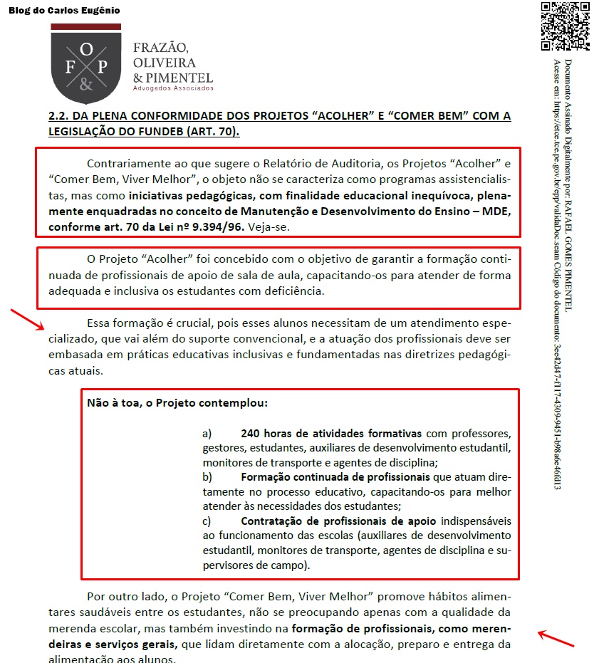 Ainda segundo a manifestação, os projetos envolveram formação continuada de profissionais, capacitação de pessoal de apoio e contratação de trabalhadores essenciais ao funcionamento das escolas, como merendeiras e monitores, o que seria compatível com o uso dos 30% do FUNDEB. A defesa também questiona o uso, pelo Relatório, de decisões judiciais ainda não transitadas em julgado como fundamento para as irregularidades apontadas. Baixe a Defesa Prévia AQUI.