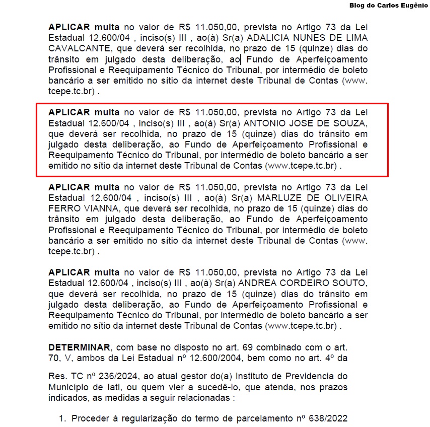 A Corte determinou a aplicação de multas e o envio dos dados dos responsáveis ao Tribunal Regional Eleitoral (TRE-PE), para eventual análise de inelegibilidade, conforme a Lei Orgânica do TCE-PE. Dentre os responsabilizados, destaque para o Ex-prefeito Antônio José de Souza, o Tonho de Lula (PSB), que foi multado em R$ 11.050,00, devendo o valor ser recolhidos ao Fundo de Aperfeiçoamento Profissional e Reequipamento Técnico do Tribunal, no prazo de 15 dias após o trânsito em julgado da decisão.