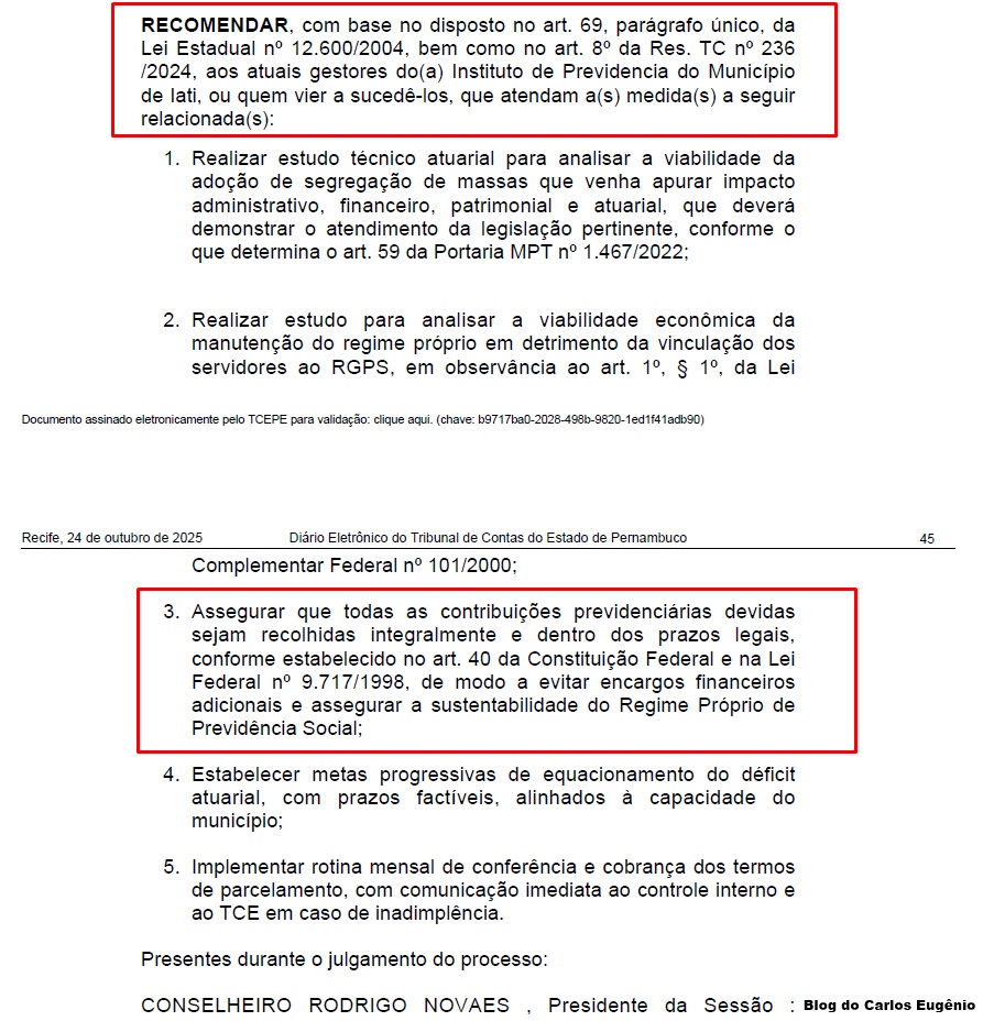 Entre as determinações e recomendações enviadas a Prefeitura de Iati, o TCE ordenou a regularização dos parcelamentos e repasses, a readequação das alíquotas de contribuição conforme os parâmetros atuariais, e a adoção de medidas para melhoria da transparência pública e do índice de governança previdenciária do Município.