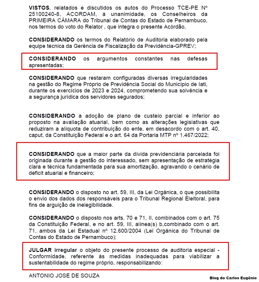 O Tribunal de Contas de Pernambuco (TCE-PE) julgou irregular a gestão do Regime Próprio de Previdência Social do Instituto de Previdência do Município de Iati (IPREVI), relativa aos exercícios de 2023 e 2024. A decisão foi tomada de forma unânime pela Primeira Câmara da Corte, durante sessão realizada no dia 21 de outubro, sob relatoria do conselheiro Eduardo Lyra Porto.