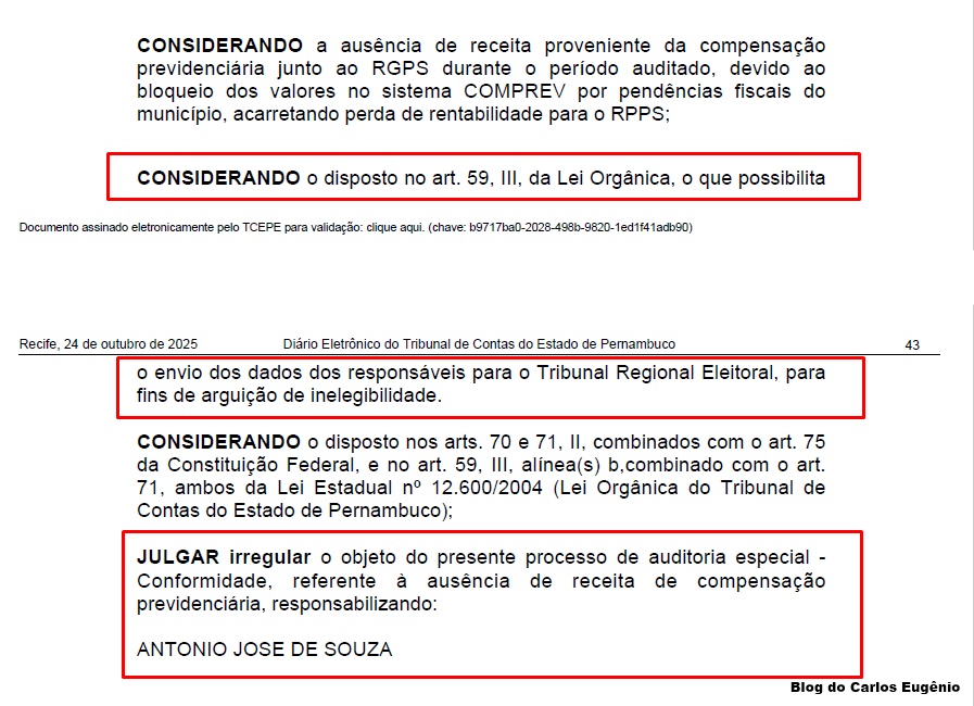 A decisão foi publicada no Diário Eletrônico do TCE-PE de hoje, dia 24, e contou com a participação dos conselheiros Rodrigo Novaes, Carlos Neves e Eduardo Lyra Porto, além do procurador do Ministério Público de Contas, Guido Rostand Cordeiro Monteiro. Baixe a decisão do Tribunal de Contas AQUI. (@blogcarloseugenio)