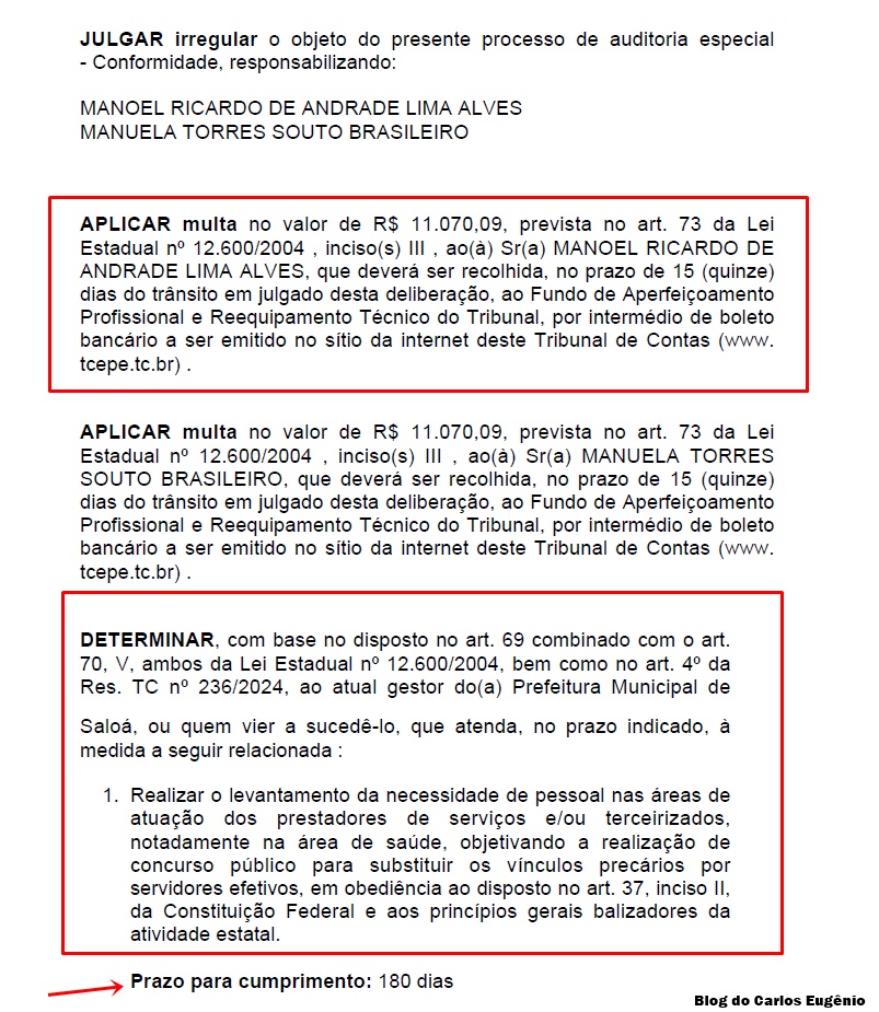 Diante das irregularidades, a Primeira Câmara decidiu, por unanimidade, responsabilizar o Ex-prefeito Ricardo Alves e a servidora Manuela Torres Souto Brasileiro, aplicando multa individual no valor de R$ 11.070,09, a ser recolhida ao Fundo de Aperfeiçoamento Profissional e Reequipamento Técnico do Tribunal, no prazo de 15 dias após o trânsito em julgado.