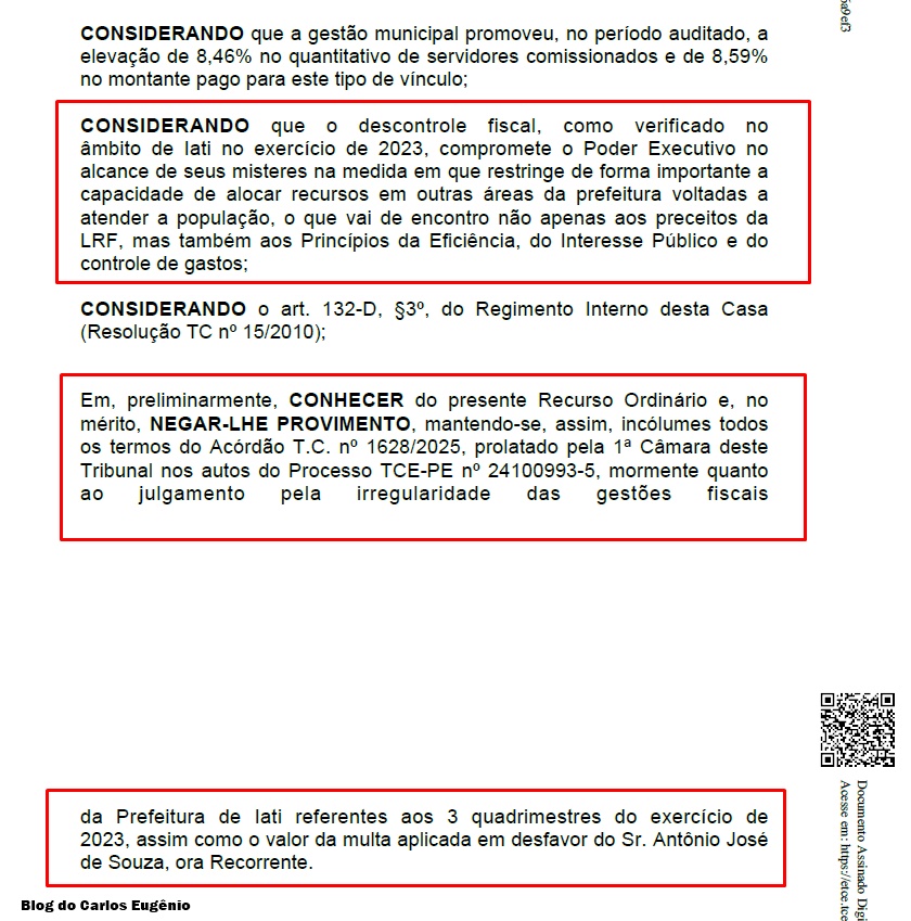Tonho de Lula havia interposto Recurso Ordinário contra o Acórdão T.C. nº 1628/2025, que julgou irregulares as gestões fiscais da Prefeitura de Iati referentes aos três quadrimestres de 2023 e aplicou multa no valor de R$ 22.680,00. No entanto, o Pleno entendeu que não foram apresentadas razões ou provas capazes de modificar a decisão anterior.