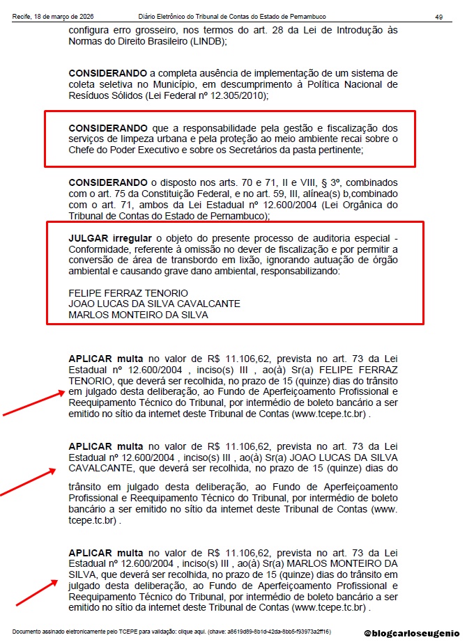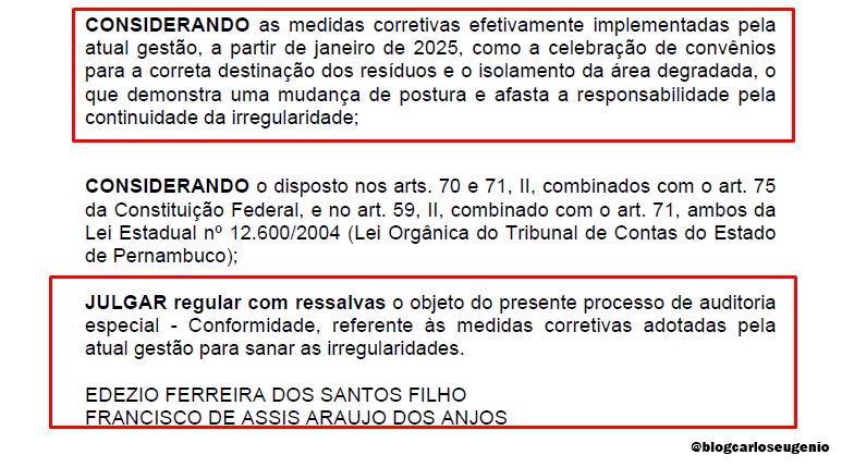 O Tribunal ainda determinou que a Prefeitura realize, em até 90 dias, a remoção total dos resíduos acumulados e assegure a destinação correta ao Aterro Sanitário de IATI ou a outra Unidade Licenciada. Também recomendou a implantação de um Plano de Coleta Seletiva, conforme a Política Nacional de Resíduos Sólidos. Baixe AQUI a decisão do TCE-PE. (@blogcarloseugenio)