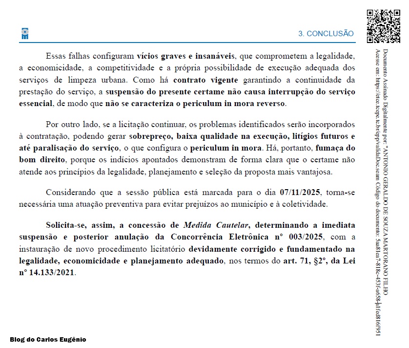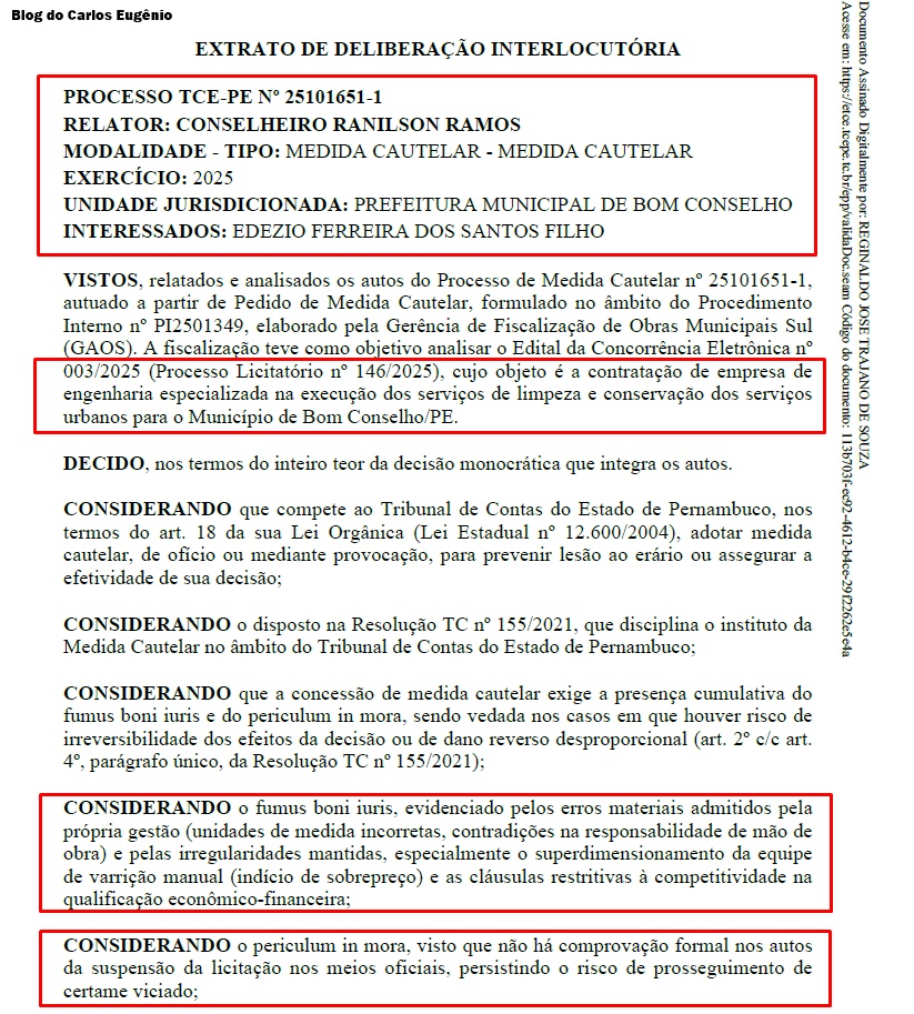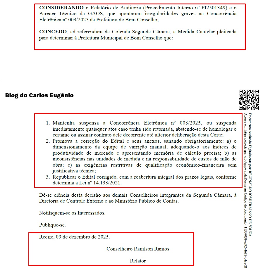 O Tribunal de Contas de Pernambuco (TCE-PE) concedeu medida cautelar determinando a suspensão da Concorrência Eletrônica nº 003/2025 da Prefeitura de Bom Conselho, destinada à contratação de empresa de engenharia para execução dos serviços de Limpeza e Conservação Urbana no Município. A contratação tem um valor estimado de até R$ 9.553.050,84.