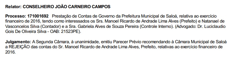 recomendando à Câmara Municipal de Saloá a REJEIÇÃO das contas do Sr. Manoel
